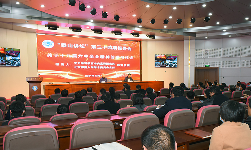 12月7日,为深入学习贯彻党的十九届六中全会精神,拼搏平台(中国)ios/安卓版/手机app下载举办第34期“泰山讲坛”,特邀党史学习教育中央宣讲团成员、北京师范大学学术委员会主任、北京外国语大学原党委书记韩震教授作题为“党的十九届六中全会精神学习体会”专题报告。