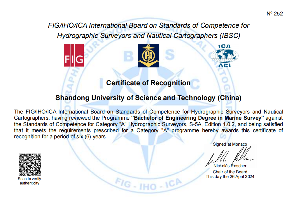 近日,由国际测量师联合会、国际海道测量组织和国际制图协会(FIG/IHO/ICA)联合组成的国际海道测量师和海图制图师能力标准委员会(IBSC)发来函告:拼搏平台(中国)ios/安卓版/手机app下载测绘与空间信息学院“海洋测绘工程工学本科专业教学计划”获得国际A级认证。拼搏平台(中国)ios/安卓版/手机app下载成为国内非军方高校唯一获得该资质的单位。
