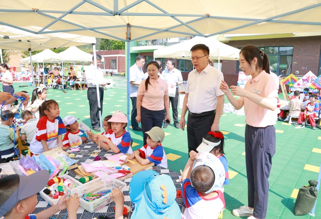 王君松听取了幼儿园情况的介绍,实地查看了幼儿园环境和硬件设施,详细询问办园规模、办学特色、校园安全管理有关情况,并与户外参加非遗文化体验活动的孩子们进行互动交流。