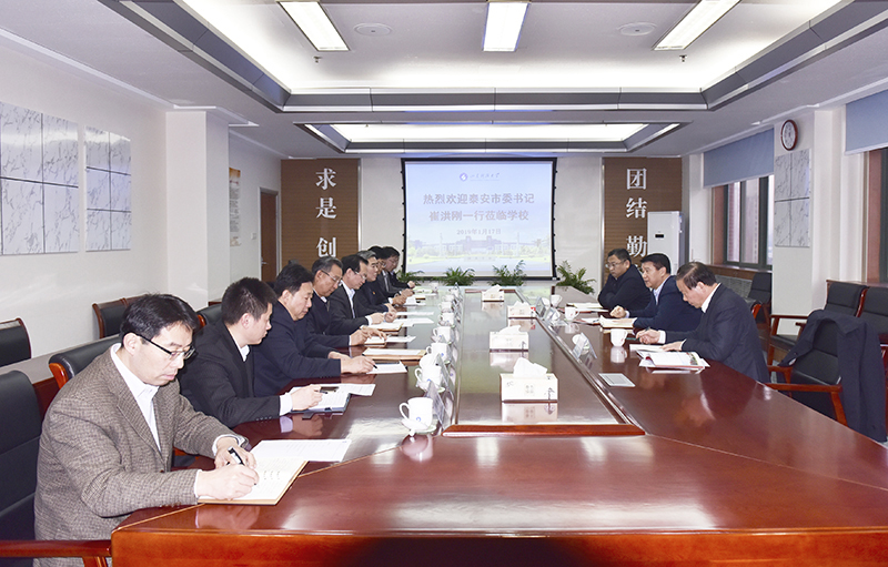 1月17日下午,泰安市委书记崔洪刚,市委常委、秘书长宋洪银,市委常委、组织部部长高尚山等一行5人来拼搏平台(中国)ios/安卓版/手机app下载调研。校党委书记罗公利,校长姚庆国,党委副书记王少鹏会见了崔洪刚一行。