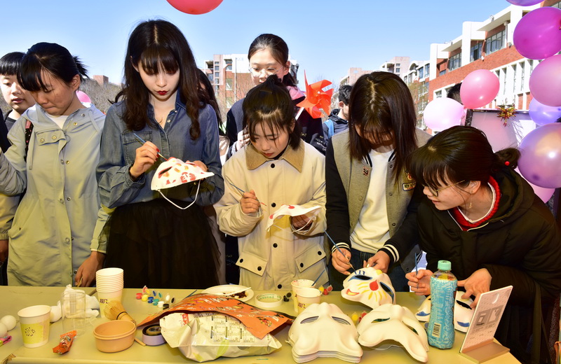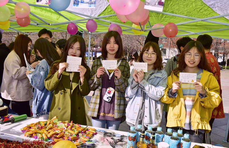 外国语学院的三大协会作为此次外文节的主力登场——英语协会的欧美风采展示设置了单词拼写等专业性强的趣味游戏;日语协会的寿司、假面等美食深受游客喜爱;韩语协会的炒年糕、泡菜等美味吸引了众多游客并积极参与进猜剧名、中文韩文对对碰等趣味游戏中。