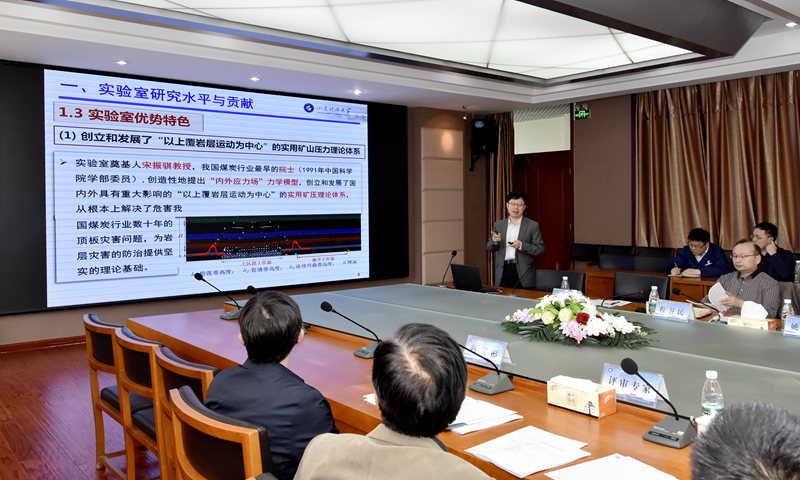 实验室主任谭云亮向各位专家详细介绍了实验室的布局、研究方向、设备运行、实验室管理制度、科研项目开展等情况。评估专家重点查看了实验室硬件建设、主要科研基础设施,了解实验室管理制度、科研项目开展等情况,对评估材料主要内容与现场情况的符合程度进行了核查。