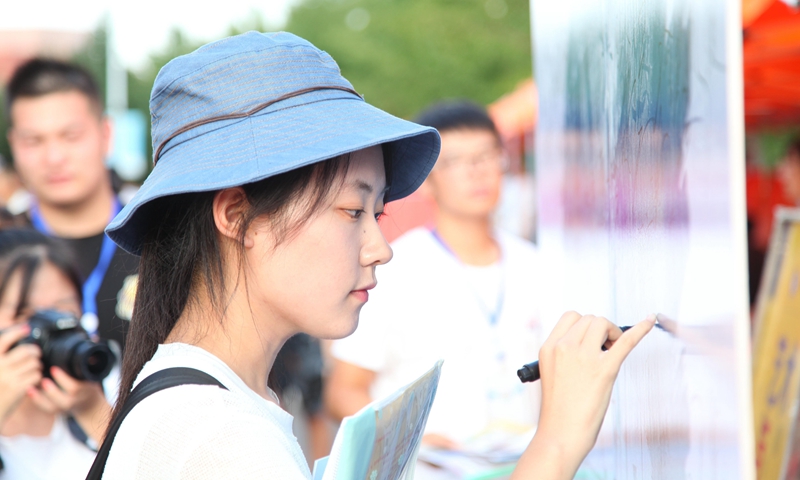 学生会为新生们提供了签名徽章,新生卢方正将签上自己名字的徽章戴在了胸前,他拿着“站在新起点,拥抱新未来”的牌子在梦想徽章墙前留下了进入大学的第一张照片。来自浙江的蒲菁选到梦想徽章后开心表示“我选到了和我的专业测绘相关的徽章——未来祖国丈量者。”
