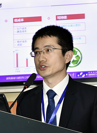 班慧勇是清华大学特别研究员、博士生导师、中国钢结构协会结构稳定与疲劳分会秘书长。他在题为“复合钢材钢结构研究进展”的报告中,介绍了复合钢材的生产制造、相关标准、工程应用以及复合钢材钢结构的研究进展等情况,介绍了其团队最新的研究成果,分析了复合钢材在结构工程领域的应用前景,特别是在近海等腐蚀环境的应用情况。