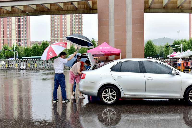 雨天,辅导员、志愿者帮忙搬行李(范琪/摄)