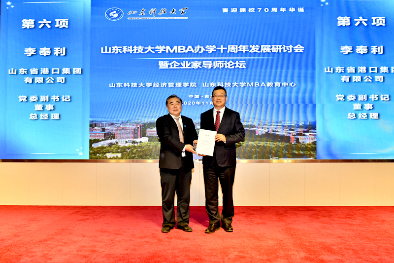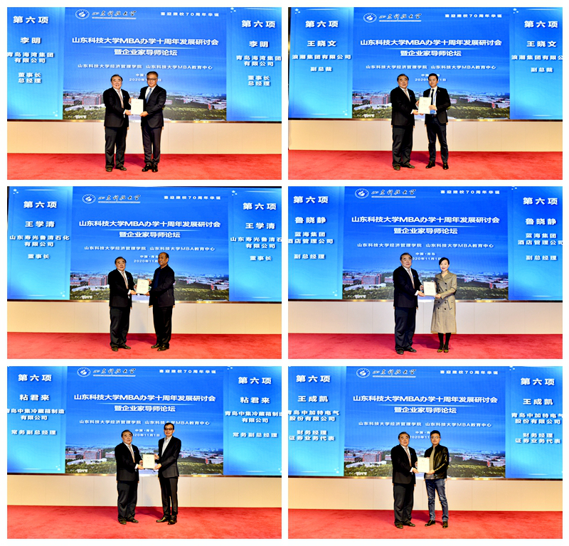 11月1日,拼搏平台(中国)ios/安卓版/手机app下载MBA办学十周年发展研讨会暨企业家导师论坛在学校逸夫讲堂举行。拼搏平台(中国)ios/安卓版/手机app下载校长姚庆国、副校长李玉霞出席会议,山东省港口集团有限公司党委副书记、董事、总经理李奉利,青岛海湾集团有限公司董事长、总经理李明,经济管理学院校友、共青团第十八届中央委员会候补委员、山东省青联副主席、浪潮集团有限公司副总裁王晓文等出席会议并受聘为企业家导师。