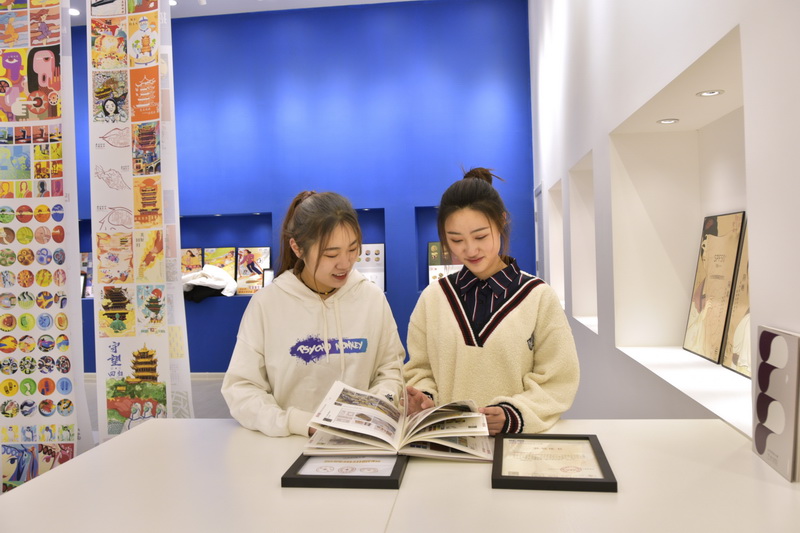 学生观看设计作品集(韩洪烁/摄)