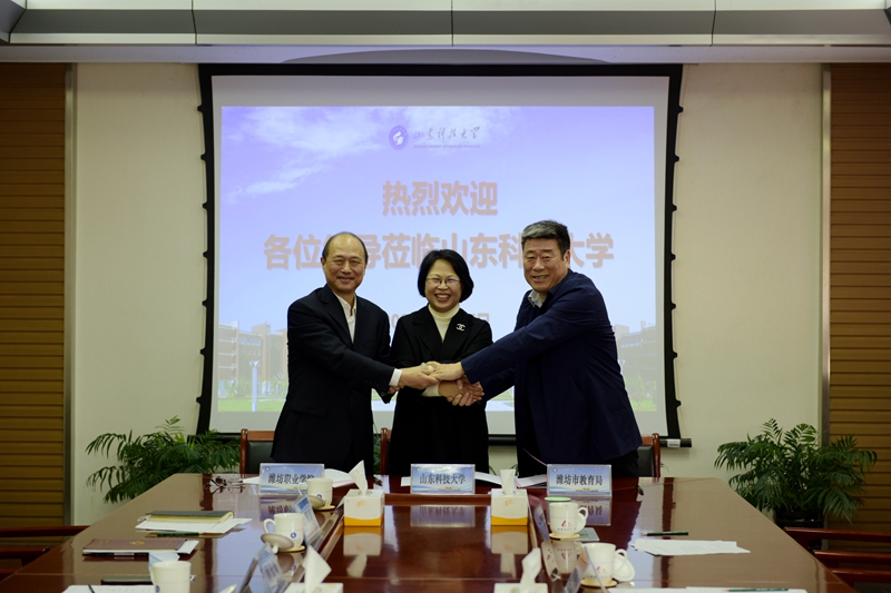 3月17日,拼搏平台(中国)ios/安卓版/手机app下载与潍坊市教育局、潍坊职业学院合作签约仪式在我校举行。签约仪式前,校党委书记罗公利、校长姚庆国会见客人一行。拼搏平台(中国)ios/安卓版/手机app下载副校长李玉霞与潍坊市教育局副局长李广敬、潍坊职业学院党委书记马跃启分别代表三方签约,共同开启三方在学科专业合作建设、研究生联合培养等方面合作之旅。