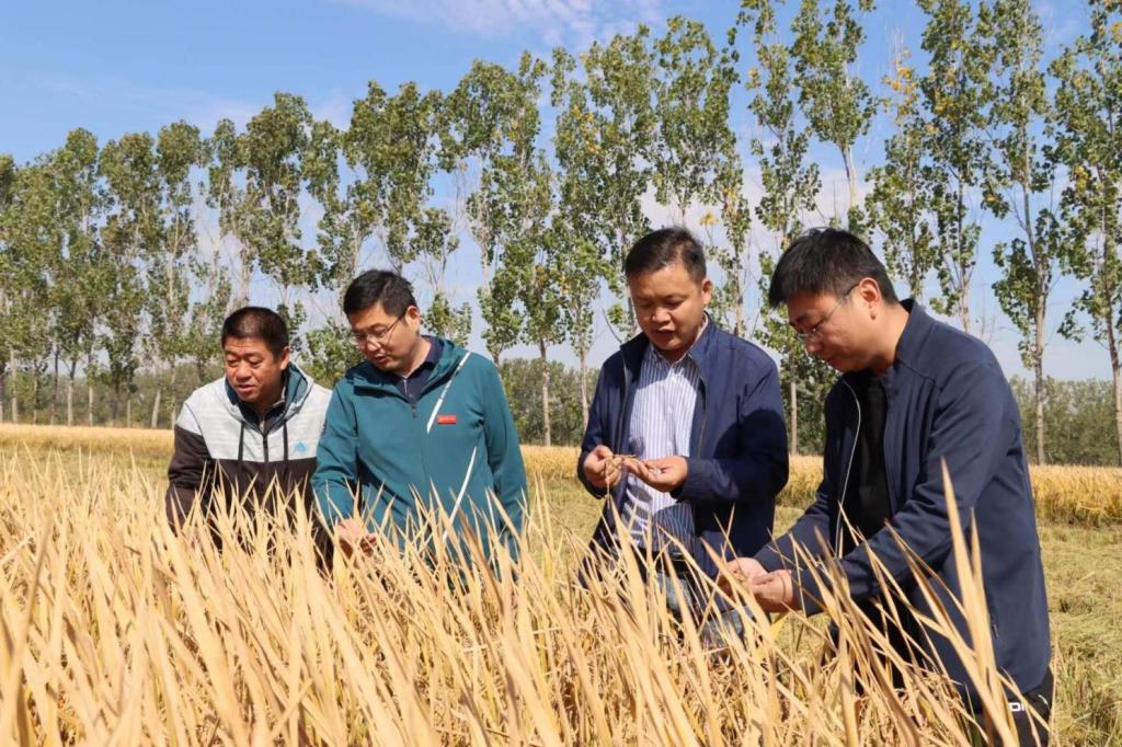 第一书记端木祥展(左一)、薛力(左二)、江峰(左三)在田间查看庄稼