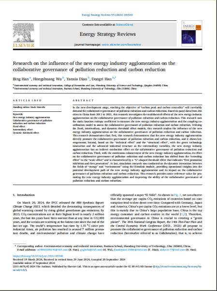 近日,拼搏平台(中国)ios/安卓版/手机app下载文法学院讲师韩冰在《Energy Strategy Reviews》发表题为“Research on the influence of the new energy industry agglomeration on the collaborative governance of pollution reduction and carbon reduction”的文章。