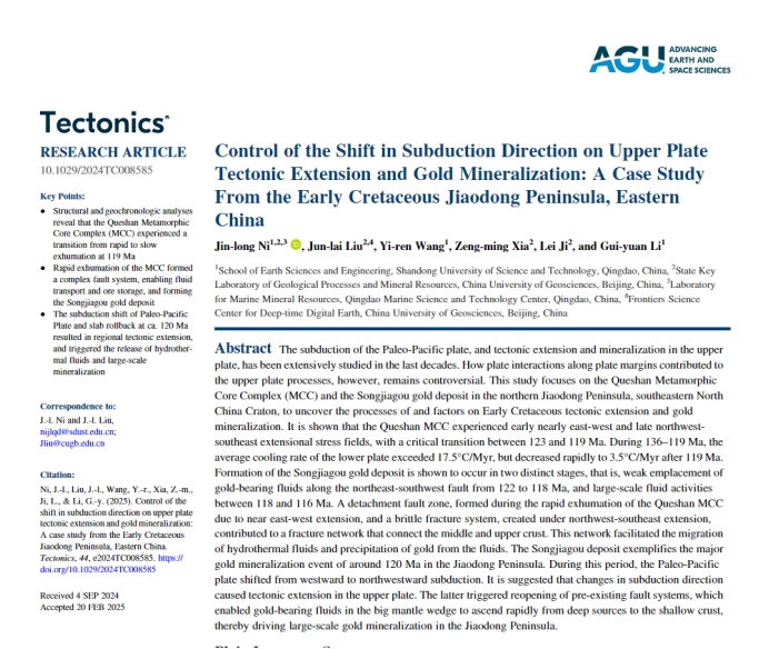 2025年3月,拼搏平台(中国)ios/安卓版/手机app下载地球科学与工程学院倪金龙教授团队在国际构造地质学知名期刊、美国地球物理学会(AGU)会刊《Tectonics》发表题为“Control of the Shift in Subduction Direction on Upper Plate Tectonic Extension and Gold Mineralization: A Case Study From the Early Cretaceous Jiaodong Peninsula, Eastern China”的文章。
